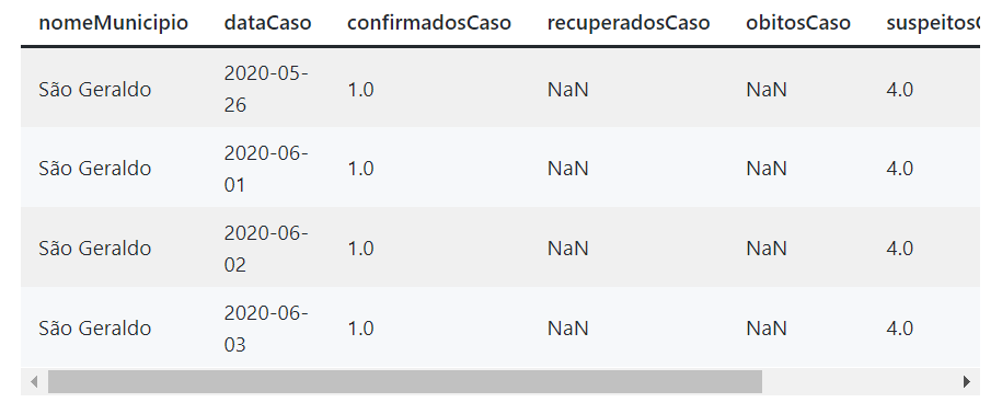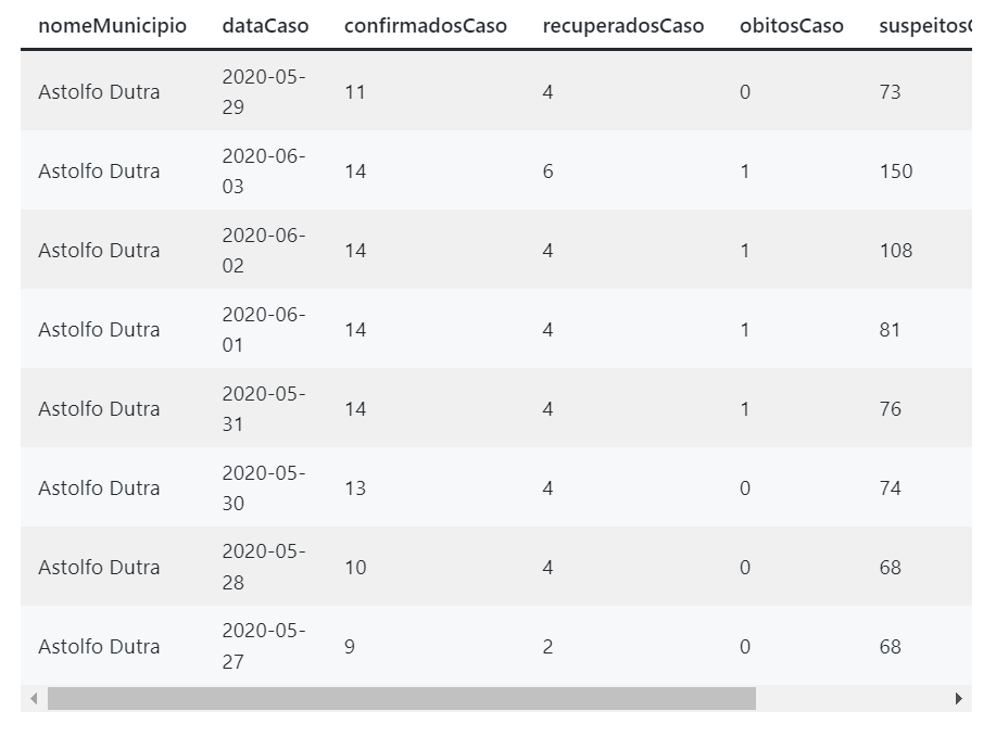 df = pd.DataFrame(columns = ["nomeMunicipio", "dataCaso", "confirmadosCaso", "recuperadosCaso", "obitosCaso", "suspeitosCaso", "descartadosCaso"])
