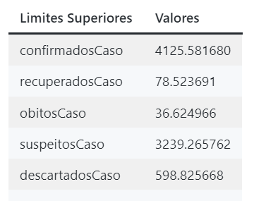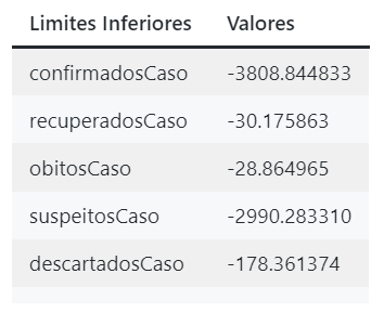 No entanto, é importante observar que cada problema tem suas particularidades. Sabemos que não é razoável esperar que o número de casos confirmados ou óbitos, por exemplo, sejam negativos. Então qualquer valor abaixo de zero já pode ser considerado um outlier e, assim, 0 é um bom limite inferior.