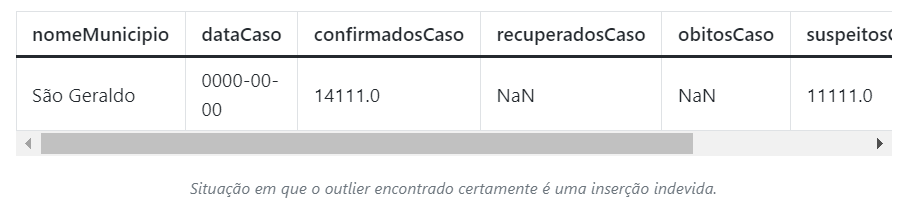 df_cidade.loc[df_cidade["confirmadosCaso"] < lower["confirmadosCaso"]]Ao executar o código acima, encontramos um registro que ultrapassa e muito o limiar superior e que certamente é um cadastro incorreto.