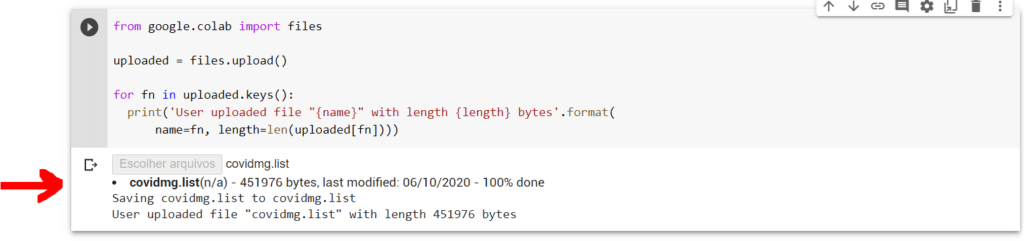 name=fn, length=len(uploaded[fn])))Ao clicar “Escolher arquivos” acima, você deve selecionar o arquivo covidmg.list baixado anteriormente.