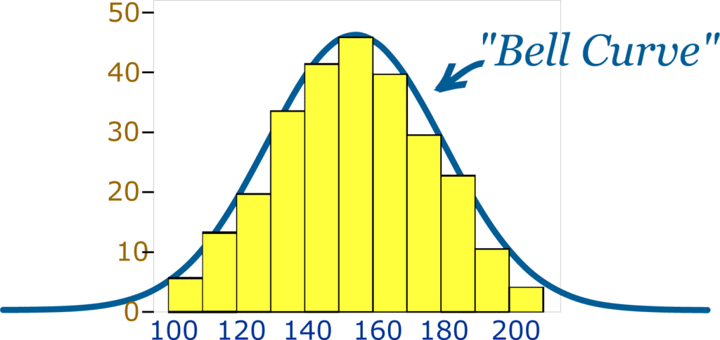 É muito comum no campo da Estatística que um conjunto de dados com alguma homogeneidade tenha seus pontos muito concentrados em torno da média. Isso faz com que assumam a forma de uma "montanha" ou "sino". Esse tipo de distribuição costuma ser chamada de distribuição normal ou distribuição gaussiana.